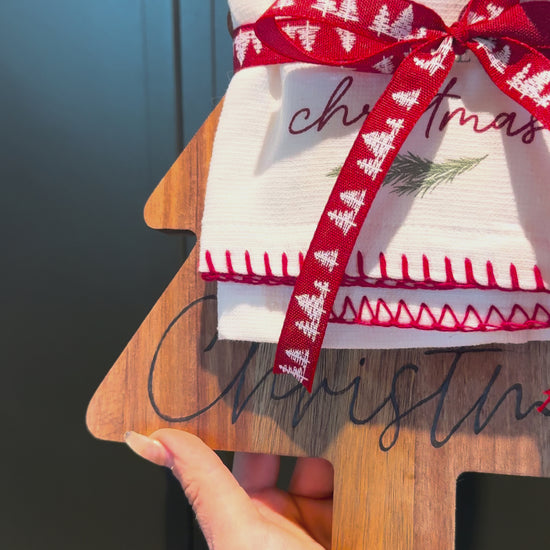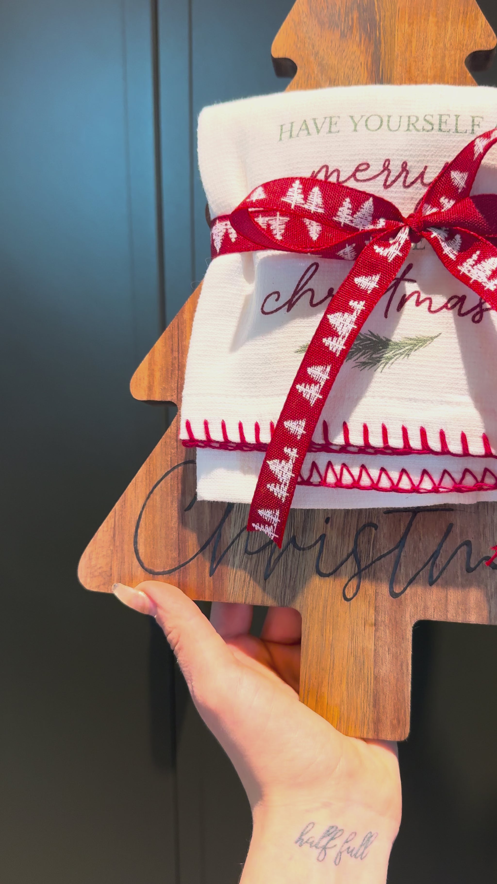 Give the gift that will add a touch of Christmas cheer to your kitchen/home! This Christmas tree-shaped board has the words "Merry Christmas" wood burned onto the front, complete with a small washcloth that has the writing "Have yourself a merry little Christmas".